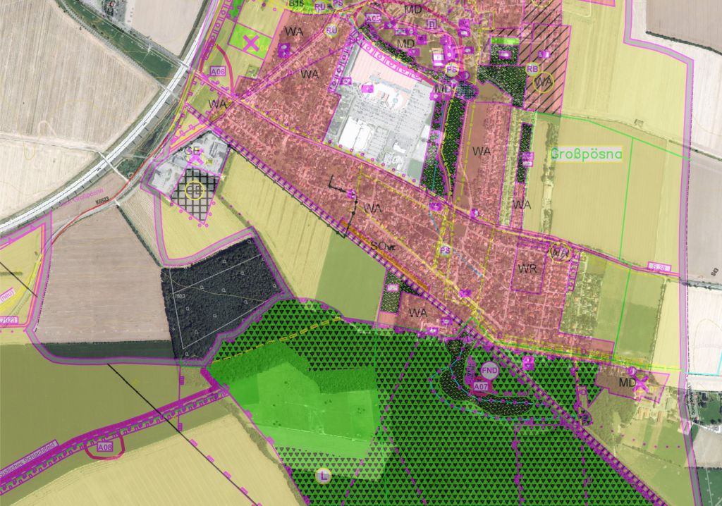 Der Flächennutzungsplan (FNP) der Gemeinde Großpösna als vorbereitender Bauleitplan wurde im Jahr 2005 durch das damalige Regierungspräsidium Leipzig genehmigt und ist seit dem 03.06.2005 wirksam.
