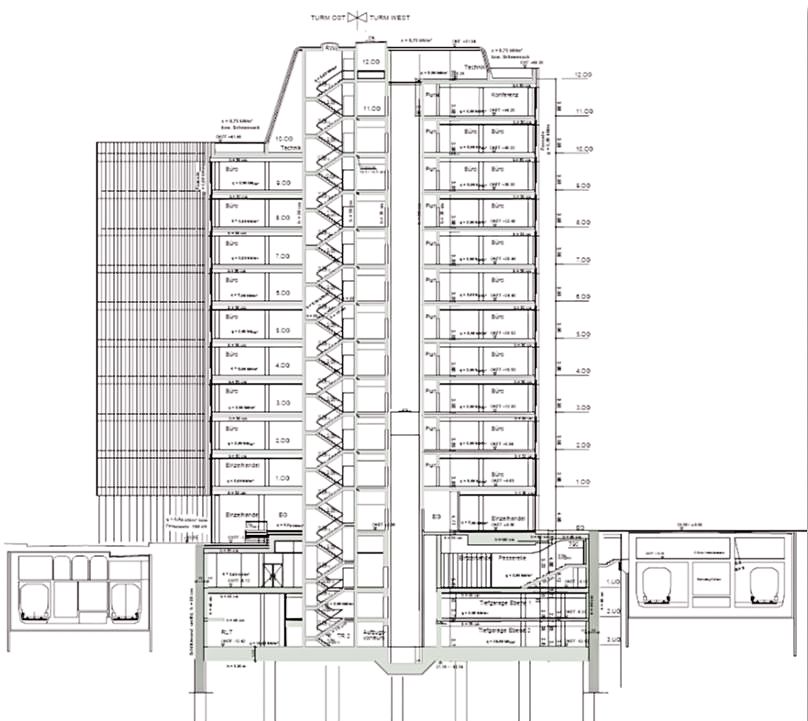 Im 11. und 12. Obergeschoss des Ostturms sind ein Konferenzsaal mit Archiv und eine Bibliothek untergebracht.