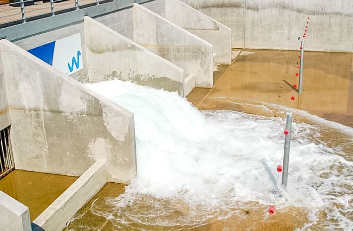 Der Kanupark am Markkleeberger See ist die erste deutsche Sportanlage, in der Wildwasserbedingungen ausschließlich durch Pumpen simuliert werden. Ein weiteres Novum ist die zentrale Positionierung des Funktionsgebäudes mit dem integrierten Pumpenhaus, die den parallelen Betrieb von zwei unabhängigen Wildwasserkanälen ermöglicht. Mit der Anzahl der einschalteten Pumpen wird die Durchflussleistung gesteuert und das Wasser auf die Kanäle verteilt. Die Strömungsrichtung wiederum wird durch mobile Hindernisse beeinflusst. Dadurch werden die Verhältnisse in den Wildwasserkanälen an die Bedürfnisse der Nutzer angepasst.