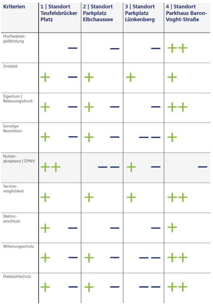 Als Prämissen für die Standortvarianten wurden Erreichbarkeit und Entfernung zum Fähranleger, sowie die Attraktivität des Angebotes an Abstellanlagen gesehen. Neben der Nutzerakzeptanz waren u. a. auch Hochwasserschutz; Servicemöglichkeiten, Ortsbilderfordernisse und eine nachhaltige Realisierbarkeit wichtige Indikatoren für die Tragfähigkeit der Lösung.